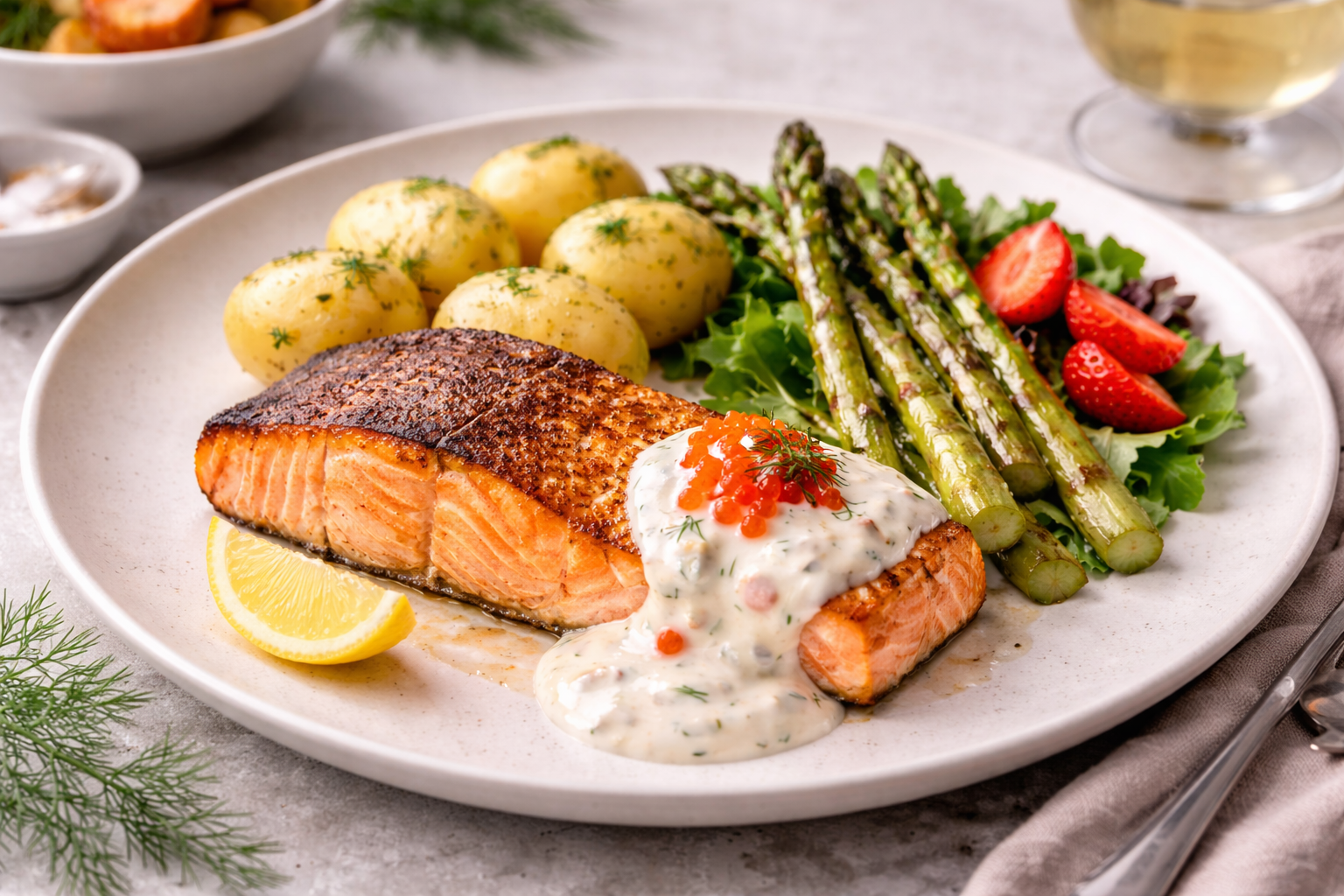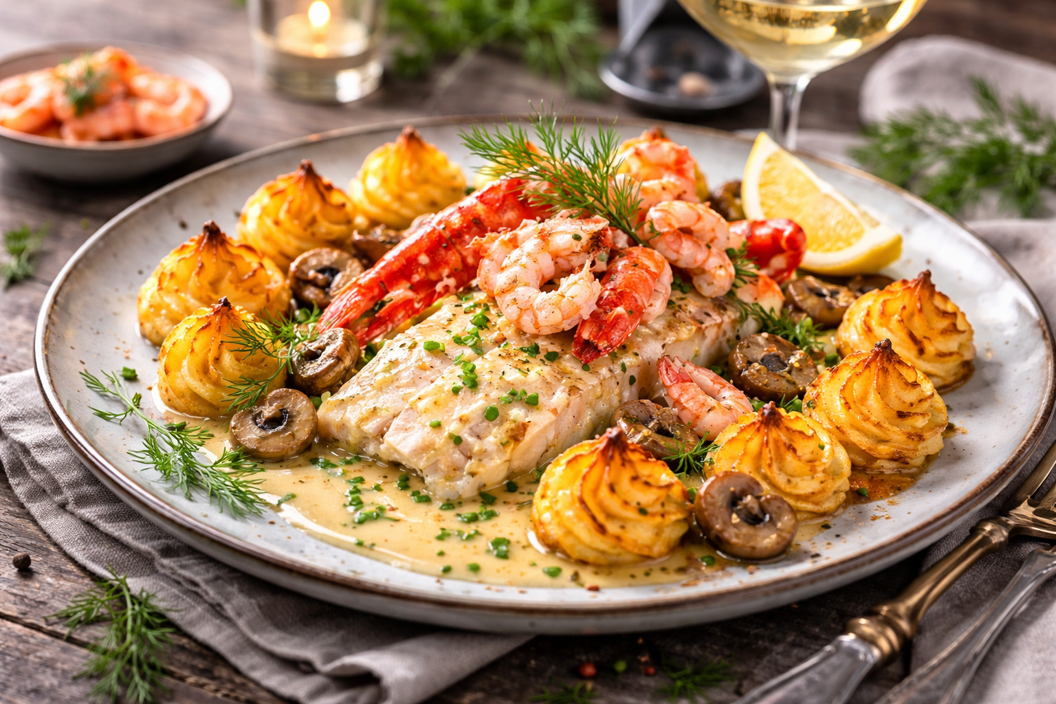 En klassisk lyxrätt från havet – där len rödtunga möter krämig vitvinssås, hummer, räkor och gyllene duchessepotatis. Perfekt när du vill imponera på riktigt.