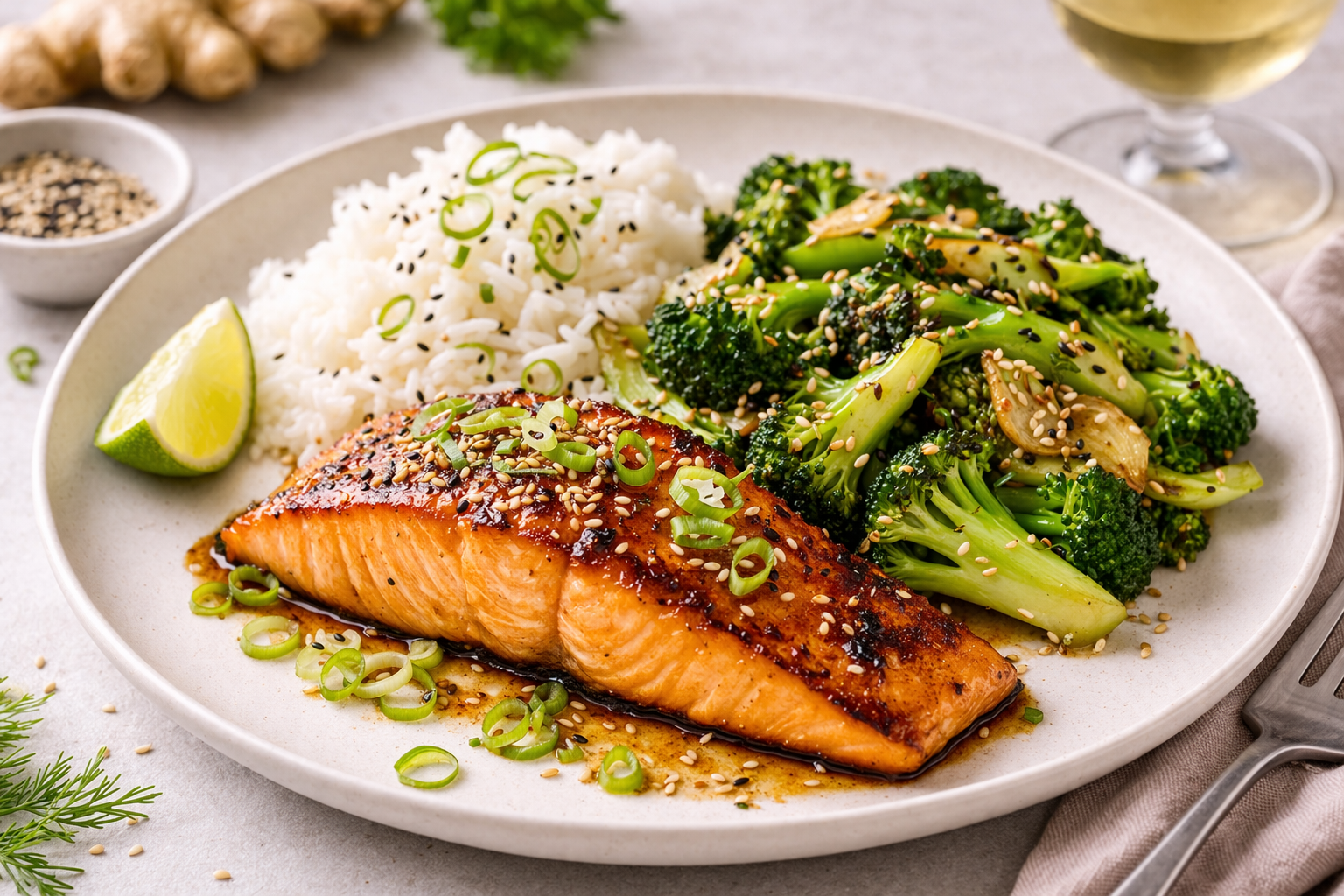 Servera laxen tillsammans med sesambroccoli och nykokt ris.