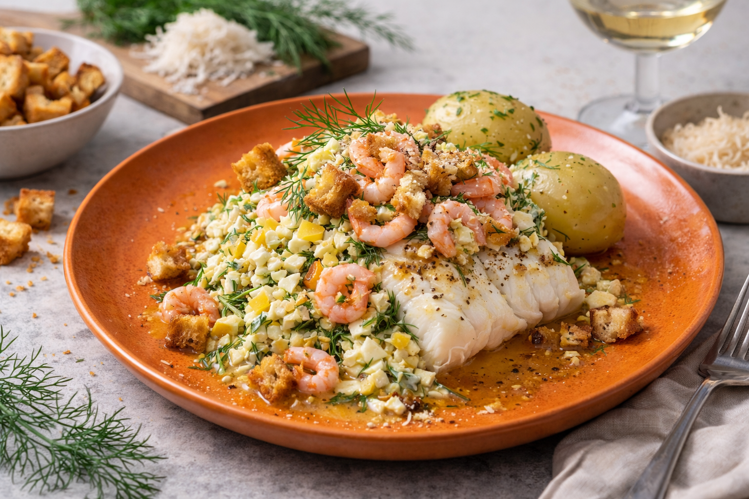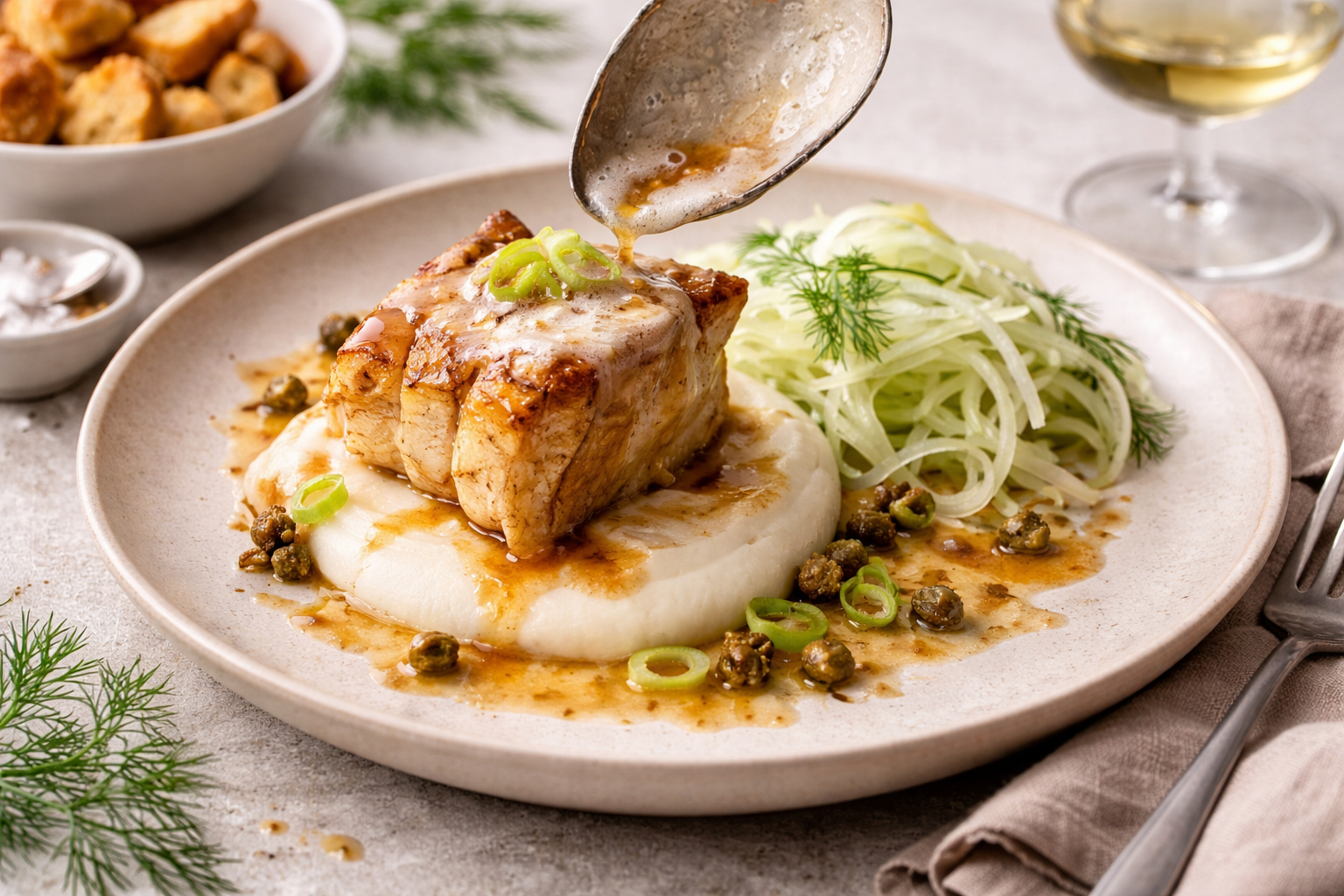 En klassisk svensk favorit i modern tappning – där saftig torsk möter brynt smör, frisk dill, sting från pepparrot och krispiga krutonger. En perfekt bjudrätt som känns både lyxig och enkel.