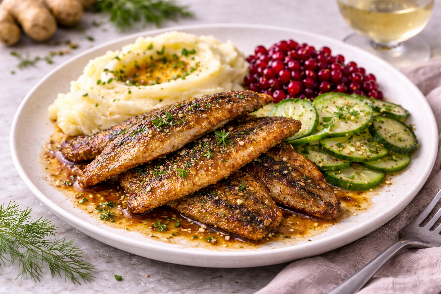 Stekt strömming med potatispuré, lingon och pressgurka